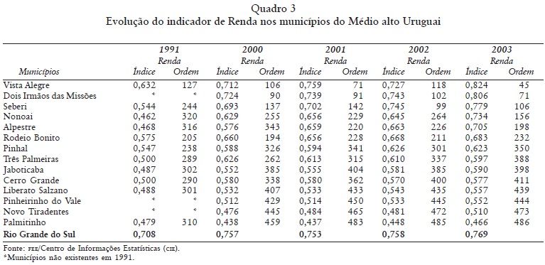 Entre 1991 e 2003, os municípios Vista Alegre, Dois Irmãos das Missões, Seberi, Nonoai, Alpestre e Rodeio Bonito, tiveram seus indicadores melhorados, inclusive subiram no posicionamento entre os demais municípios do Rio Grande do Sul (Quadro 3). No mesmo período, os municípios Pinhal, Três Palmeiras, Jaboticaba, Cerro Grande, Liberato Salzano, Pinheirinho do Vale, Novo Tiradentes, melhoraram o indicador, porém, pioraram seu posicionamento em relação aos demais municípios do Rio Grande do Sul. Palmitinho foi exceção, pois seu indicador de Renda piorou, rebaixando sua posição de 310 para 486. O indicador de Renda obteve, em 2003, um crescimento anual (1,45%) em relação aos anos anteriores, sendo que, junto com o indicador de Educação, foi o responsável pela melhora do IDESE neste ano.