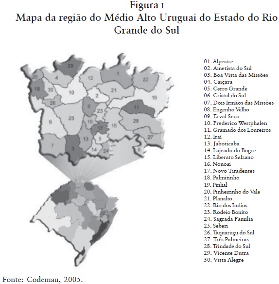Atualmente, existem 24 Coredes constituídos no Estado. Entre eles está o Coredes Médio Alto Uruguai, também chamado de Codemau, o qual abrange a área dos municípios objeto dessa pesquisa e compreende os municípios do extremo norte do Estado do Rio Grande do Sul. Faz divisa com o Estado de Santa Catarina (Figura 1), possui 173.080 habitantes, distribuídos numa área de 5.258,0 km², configurando uma densidade demográfica de 32,91 hab/km² (Fee, 2004). Configura algo em torno de 2 % do total do território gaúcho. Nesse espaço estão distribuídos 30 (ou 6 % dos 496) municípios gaúchos. Em função destas proporções decorre a existência de municípios de pequeno porte no que diz respeito à sua dimensão geográfica.