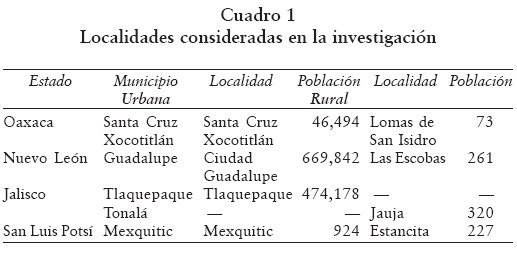 e). Que las localidades pertenecieran a estados con diferentes niveles de desarrollo. De ahí que se seleccionaran Nuevo León, Jalisco, San Luis Potosí y Oaxaca. Las localidades elegidas en cada estado y municipio se muestran en el cuadro 1.
