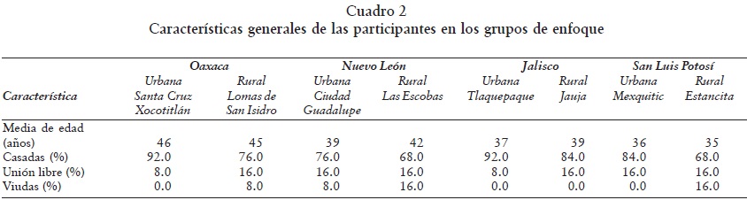 Las beneficiarias se seleccionaron en función de su registro en el padrón vigente, de su disponibilidad y de su interés en participar en las reuniones. La selección consistió de dos etapas principales: primero se eligió al azar a una de las vocales de acuerdo con el padrón proporcionado por personal de la Coordinación Nacional del Programa Oportunidades. Luego, en compañía de la vocal se invitó a participar a beneficiarias de la localidad. Al momento de invitarlas se verificó su identificación de pertenencia al programa, se les explicó el propósito de la reunión, la mecánica general y el lugar y la hora donde se llevaría a cabo. Se les dejó una invitación formal y posteriormente se pasó a cada domicilio para confirmar la asistencia a la reunión. En un principio pensamos que tal vez las titulares sugeridas por las vocales, y que aceptaron participar en las reuniones de grupos de enfoque, fueran quienes tuvieran más conocimiento y mejor actitud hacia el programa, pero los resultados de las dinámicas mostraron que esto no necesariamente fue cierto, además de que los ayudantes de investigación de avanzada, una vez instalados en cada lugar, seleccionaron al azar a alrededor de 60% de las asistentes a cada grupo de enfoque. En el cuadro 2 se ve el perfil demográfico de las participantes.