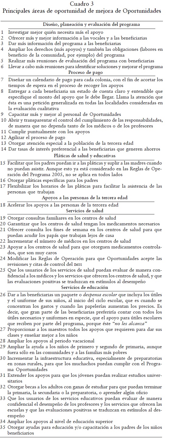 En las dinámicas de los grupos de enfoque los investigadores fueron identificando diferentes áreas de oportunidad de mejora del programa, las cuales se analizaron con las participantes. Adicionalmente, al final de cada dinámica se les pidió a las beneficiarias que hicieran sugerencias de mejora a Oportunidades.30 Las sugerencias principales se presentan en el cuadro 3. Se modificaron lo menos posible, porque mientras más textual sea la versión, mayor será la cercanía que ganará el lector con el sentido de los testimonios.