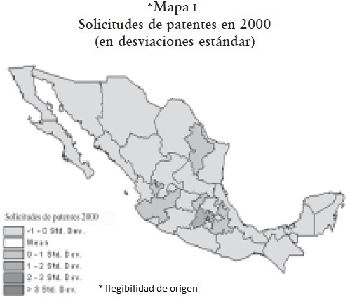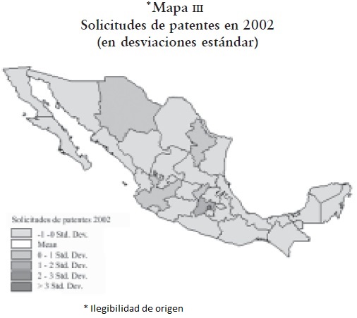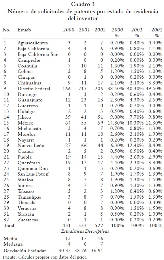 Se puede ver que hay una fuerte concentración de solicitudes de patentes en el Distrito Federal y el Estado de México, representando ambas entidades alrededor de 50% de la capacidad inventiva del país (cuadro 3), y les siguen los estados de Jalisco y Nuevo León. Hay entidades que no producen o solicitan ninguna patente o bien que no rebasan las dos solicitudes, como son los casos de Baja California Sur, Campeche, Chiapas, Tlaxcala y Zacatecas. Cabe mencionar que el número absoluto de patentes aumentó en el periodo estudiado así como la desviación estándar; significando esto último, un mayor alejamiento o diferenciación entre los estados.