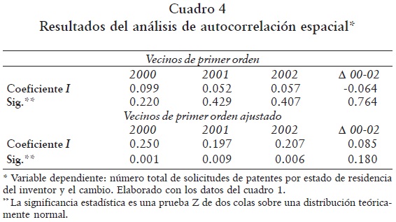 En cuanto a la prueba de la hipótesis 1 que predice una concentración espacial de las solicitudes de patentes, los resultados nos sugieren la aceptación de tal hipótesis (cuadro 4). Es decir, efectivamente la actividad en patentes se halla espacialmente concentrada en todos los años analizados.