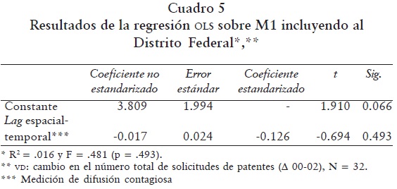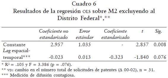 El M2, que excluye al Distrito Federal en el análisis de regresión, ofrece información que incluso no esperábamos encontrar: un proceso de contracción espacial dependiente de la distancia. Es decir, la exclusión del Distrito Federal y su preeminencia en la actividad de patentes evidencia un proceso de divergencia o disparidad regional en tal actividad, explicada por el alejamiento de los estados más productivos en solicitudes de patentes, que son el Estado de México, Jalisco y Nuevo León, de las demás entidades del país.