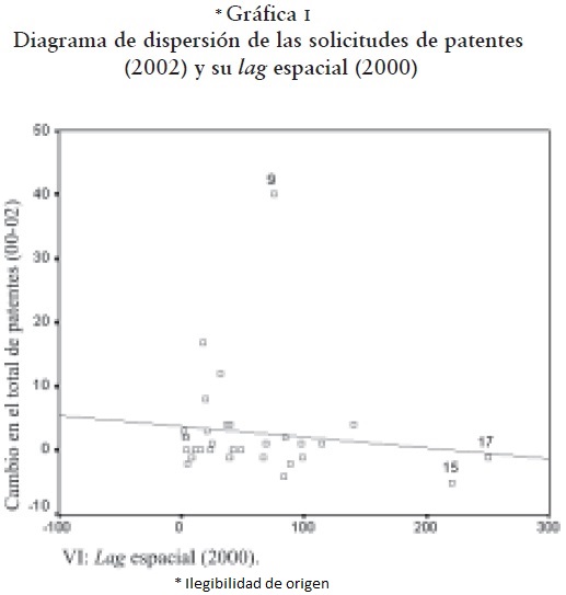 Es importante explicar que M1 considera dentro de la muestra al Distrito Federal y utiliza los datos de solicitudes de patentes en porcentajes por estado y sin normalizar. Cabe señalar esto porque en la gráfica I mostramos el diagrama de dispersión de los estados mexicanos en cuanto a las dos variables utilizadas en este modelo, y lo que observamos son varias entidades que se alejan sobre el eje "x", como son el Estado de México (15) y Morelos (17), y sobre el eje "y" el Distrito Federal (9). Este último contribuye a aumentar el lag espacial-temporal a favor de sus vecinos Estado de México y Morelos.