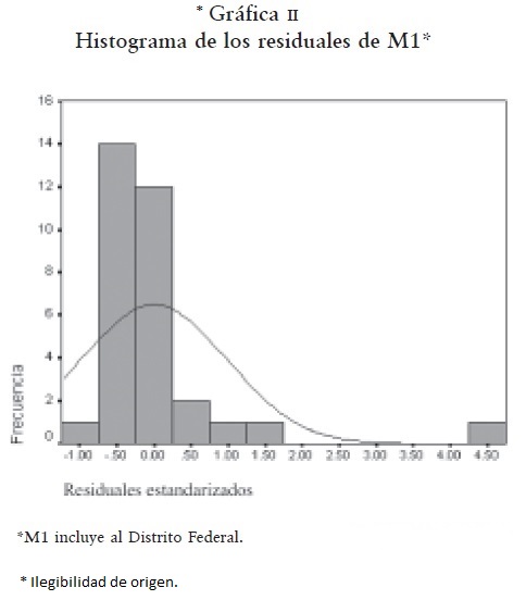 Estadísticamente hablando, lo importante de distinguir este fenómeno de outliers entre los estados es que los coeficientes de la línea de regresión obtenida a través del método de mínimos cuadrados pueden ser imprecisos. La presencia de una observación, en este caso un estado, afectando el cómputo de los coeficientes se ve en la gráfica II, donde se observa al Distrito Federal alejado del resto de los estados y mostrando un comportamiento no normal de los residuales; un prerrequisito del análisis de regresión. También muestra que la ecuación resultante de este modelo no predice correctamente el comportamiento de la VD para tal entidad federativa.