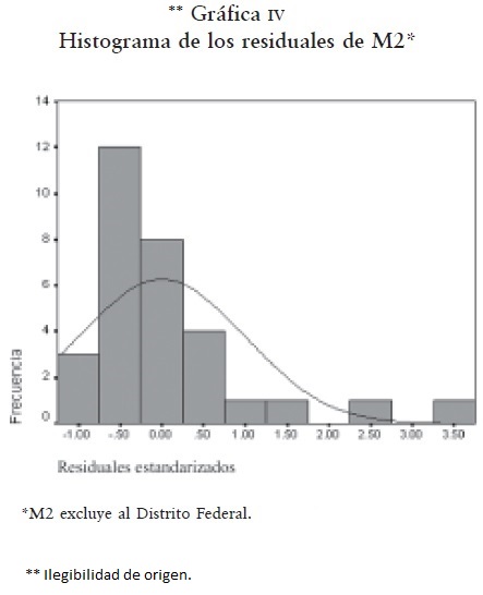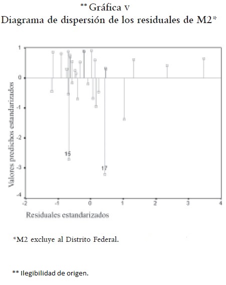 La gráfica III es similar a la I pero se distingue en que representa residuales y valores predichos estandarizados de M1. Igualmente muestra los residuales correspondientes al Distrito Federal (marcado como el estado 9 y alejado sobre el eje "x") y los estados de México y Morelos (15 y 17, respectivamente, y alejados sobre el eje "y"). Los residuales son estimaciones de error o distancias en el ajuste de los datos a la línea de regresión entre dos valores: los observados y los predichos de la VD modelada. También representan una forma de estimar la variación no explicada por el modelo elegido.