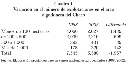 Considerando los dos últimos censos nacionales agropecuarios, el área algodonera localizada en el centro de la provincia, entre 1988 y 2002 registró una disminución de 1,957 explotaciones. Este total encubría dos tendencias: por una parte un aumento de 181 explotaciones de más de 500 hectáreas y, por otra, la tendencia más notoria fue una disminución de 2,138 explotaciones menos en dicho periodo para los estratos inferiores a 500 hectáreas. A su vez, dentro del gran grupo el número de explotaciones de menos de 100 hectáreas disminuyó en 1,439 explotaciones.