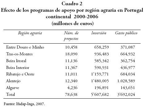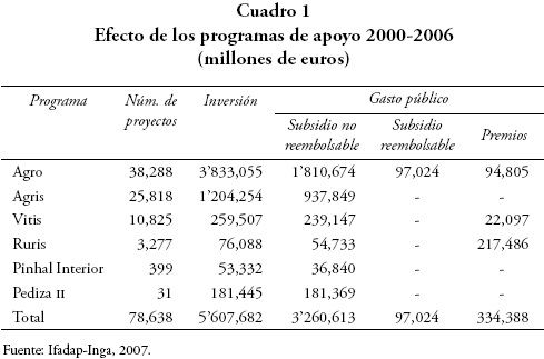 En este marco, Portugal ha diseñado e instrumentado seis programas de apoyo a la agricultura (Leal, 2007) estos son: Agro es el programa más importante enfocado a dar apoyos de inversión a las explotaciones agrícolas en términos de impulsar la transformación y comercialización de los productos agrícolas, integrado en 13 medidas de apoyo; Agris, este programa en parte incide sobre las áreas de influencias del programa anterior, pero básicamente da apoyo a la pequeña agricultura, integrado en 10 medidas o acciones de apoyo; y por último se encuentran los programas especializados dirigidos a ciertos sectores y regiones de Portugal: Vitis (apoyo a la reconversión y re-reestructuración de viñedos), Ruris (apoyo a los predios agrícolas), Pinhal Interior (accion integrada de desarrollo) y Pediza ii (acción integrada de desarrollo). El efecto de estos programas en Portugal continental se muestra en los cuadros 1 y 2.