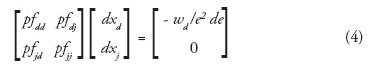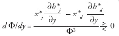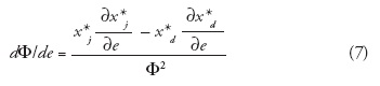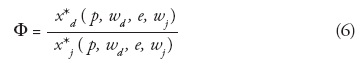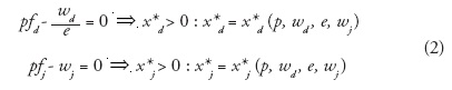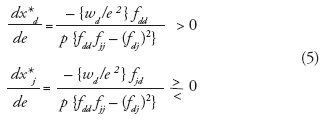 Dado que la matriz Hessiana es negativa definido el término {fdfd - (fdj)2}> 0. En consecuencia rendimientos marginales en xdimplican dx*d / de > 0. Es decir, depreciaciones de la moneda doméstica incrementan la demanda de la maquila por los insumos nacionales. En el caso de las variaciones de la demanda del insumo extranjero por cambios en e, es obvio que signo (fjd) ⇒signo (dx*j / de). Por tanto, reducciones de la productividad marginal del insumo extranjero por cambios marginales del insumo local resultan en signo fjd < 0 ⇒dx*j / de > 0. En este caso, una depreciación del tipo de cambio incrementa la demanda de insumos extranjeros.