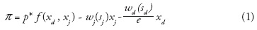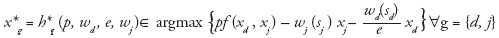 , donde C es el costo de producción o presupuesto de una empresa para producir. El precio del insumo es wg (sg ) y depende de la calidad del mismo sg ∀g = {d,j }, e es el tipo de cambio, es decir, representa la moneda doméstica que un dólar puede comprar. Como la maquila exporta su producción, sus ingresos son en moneda extranjera (dólares). Si la maquila se integra verticalmente con una proveedora doméstica el costo del insumo se paga en moneda doméstica (es decir, el costo wd (sd )xd es en pesos), mientras que {wd(sd)/e}xd representa el costo equivalente del insumo nacional en moneda extranjera. Si la maquila comercia con la firma extranjera, entonces el importe pagado por sus insumos (wj(sj)xj) es en moneda extranjera.