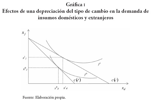 Así, un incremento del tipo de cambio desplaza la curva de iso-costo de C (e0) a C (e1), lo que induce un efecto sustitución y un efecto similar al efecto renta de la teoría de la elección del consumidor, al que vamos a llamar un efecto presupuesto. Un incremento del tipo de cambio induce un efecto sustitución ya que demandar insumos domésticos en relación con insumos del extranjero es relativamente menos costoso. Además, un incremento del tipo de cambio induce un efecto presupuesto positivo, ya que el mismo presupuesto de la firma le permite adquirir una mayor cantidad de insumos, lo que puede incrementar la demanda de los dos insumos de la firma. El resultado final de la interacción de los efectos sustitución y presupuesto se muestra en la gráfica I, en la que una depreciación del tipo de cambio incrementa la demanda de ambos insumos.9