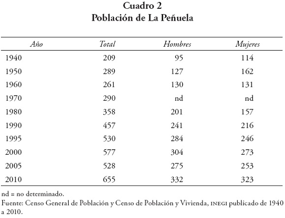 El primer dato censal formal sobre población total se remonta a 1940, cuando la localidad contaba con 209 habitantes (cuadro 2). Para la segunda mitad del siglo XX la población se mantuvo en torno al medio millar de habitantes con un ligero repunte en la primera década del siglo XXI.