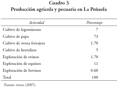 La actividad agropecuaria en La Peñuela ha pasado por diversos periodos, durante el establecimiento de la ranchería que corresponde con la primera década del siglo XX, la actividad económica se centraba exclusivamente en la crianza extensiva de ganado vacuno. El periodo entre 1920 y hasta finales de los cuarenta se caracterizó por el predominio de la actividad pecuaria pero ya con la incorporación de actividades agrícolas de subsistencia por medio del cultivo del maíz. Hacia los años cincuenta se dio una transición hacia el cultivo de la papa y la sustitución de la cebada por el trigo como cultivo forrajero. Desde principios de los setenta y hasta finales de los noventa se presentó un cambio en la actividad pecuaria hacia la crianza extensiva de ganado ovino, así como la diversificación de los cultivos y la mecanización de la agricultura. Finalmente, durante la primera década del siglo XXI disminuyó radicalmente la producción pecuaria, prevaleciendo la agricultura comercial principalmente de papa y flores de ornato.
