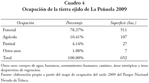 Durante la primera década del siglo XXI ha prevalecido en la localidad el cultivo de la papa como motor de la agricultura. En los últimos años ha venido proliferando el cultivo de flores a cielo abierto o en invernadero. Esta actividad ha sido promovida por medieros13 provenientes de la región de Villa Guerrero y que invierten en la producción de flores de ornato como la nube,14 el cempazúchitl,15 la margarita y el crisantemo,16 así como de plántulas para su venta en los invernaderos de aquella importante región floricola (Conanp, 2013b). Hacia el año 2007, el cultivo de papa abarcaba 73% de la superficie agrícola, mientras 1.7% correspondía al cultivo de avena forrajera (cuadro 3). Se estima que hacia el año 2009 la cubierta forestal cubría más de 70% de la superficie del ejido, mientras una mínima parte era ocupada por los cuerpos de agua, asentamientos humanos, caminos, etc. (cuadro 4).