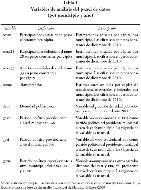 En esta sección se describen los aspectos metodológicos del análisis de las relaciones intergubernamentales y del sistema de transferencias. Particularmente, nos centramos en la base de datos, las variables de análisis y la metodología utilizada. Aquí adoptamos tres supuestos para facilitar el análisis propuesto. El primero es que la intencionalidad de los involucrados en la realización de políticas se refleja en las cifras de transferencias intergubernamentales planeadas; el segundo es que el grado de desarrollo local se refleja en la densidad poblacional; finalmente, el tercer supuesto es que la preferencia política prevaleciente a nivel local es similar a aquella sustentada por el partido político del presidente municipal vigente.