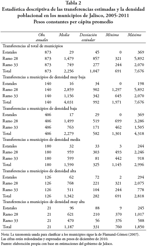 En esta sección se muestran las estadísticas descriptivas que evalúan las relaciones entre las transferencias planeadas, la densidad poblacional y los partidos políticos. Las estadísticas descriptivas se refieren a las medias y desviaciones estándar muestrales de las transferencias per cápita considerando tres grupos de municipios para el periodo 2005-2011. El primer grupo incluye al total de los municipios de Jalisco y se utiliza como referencia.13 El segundo incluye a municipios agrupados con base en un criterio de densidad poblacional. El tercero a los agrupados con base en un criterio político. Por simplicidad, se presentan los resultados de estadística descriptiva mediante tablas.