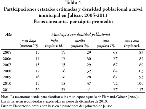 La tabla 4 muestra que las participaciones estatales planeadas hacia los municipios crecen en términos reales durante el periodo analizado. Sin embargo, también indica que este crecimiento no ha sido constante. De manera específica, en la tabla se sugiere que las participaciones estatales están directamente relacionadas con el grado de desarrollo municipal. Las transferencias suelen crecer conforme se incrementa la densidad poblacional. A manera de ilustración, en el año 2011, el promedio de participaciones per cápita para municipios de muy alta densidad resulta 5.85 veces mayor al de aquéllos de muy baja densidad (117/20=5.85). Así, las cifras sugieren que existe un criterio de distribución regresivo en la planeación estatal.