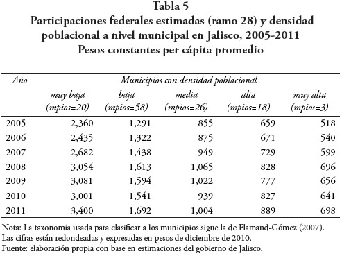 La tabla 5 muestra que las participaciones federales planeadas asociadas al ramo 28 crecen en términos reales durante el periodo. En la tabla se sugiere que, a diferencia de las participaciones estatales, las federales están inversamente relacionadas con la densidad poblacional municipal. Los datos indican que la vinculación entre las transferencias planeadas y el grado de desarrollo dependen del nivel de gobierno que asigna los recursos. Particularmente en 2011, el promedio de participaciones per cápita para los municipios de muy baja densidad resulta 4.87 veces mayor a los de muy alta densidad (3400/698=4.87). La evidencia sugiere que existe un criterio de distribución progresivo a nivel federal.