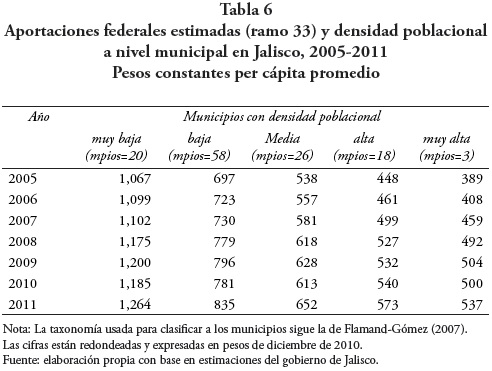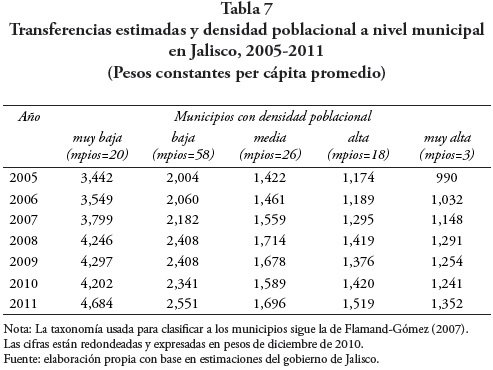 La tabla 7 muestra las tendencias agregadas en la planeación gubernamental hacia los municipios de Jalisco. Sin sorpresa, la tabla confirma que las participaciones estimadas crecen en términos reales entre 2005 y 2011. Asimismo, sugiere que las transferencias alcanzan un nivel máximo en 2008. En este contexto, cabe mencionar que en la tabla se muestra que el total de transferencias estimadas está inversamente relacionado con el grado de desarrollo de los municipios. Este hecho es interesante porque indica que, en el agregado, predomina un criterio redistributivo progresivo. Incluso, en 2011, el promedio de transferencias per cápita para los municipios de muy baja densidad resulta 3.46 veces mayor al de aquéllos de muy alta densidad (4684/1352=3.46).