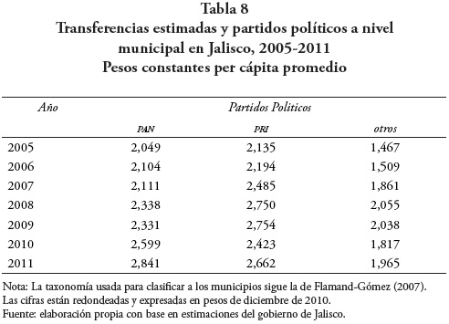 La tabla 8 muestra que las transferencias intergubernamentales planeadas dependen de los partidos prevalecientes en los municipios. Particularmente entre 2005 y 2009, las transferencias hacia los municipios del PRI son más altas que aquéllas de los municipios del PAN, posteriormente esta situación se revierte a favor del PAN. Las cifras también señalan que las transferencias hacia municipios del PAN aumentan 1.39 veces entre 2005 y 2011 (2841/2049=1.39). Las transferencias hacia municipios del PRI aumentan 1.25 veces (2662/2135=1.25). Asimismo, las cifras muestran que las menores transferencias son para municipios donde prevalecen otros partidos; estas cifras sugieren que en la planeación gubernamental se viola el principio de no discriminación política.