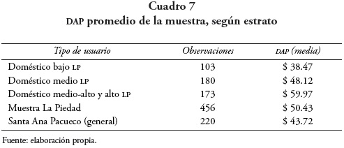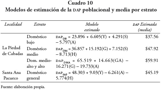 De acuerdo a la estratificación de hogares empleada para la población de La Piedad según tipo de usuario del servicio local de agua potable, el resultado en cuanto a la DAP fue consistente con el segmento socioeconómico, de forma que el estrato doméstico bajo obtuvo una DAP mensual de $38.47, el estrato doméstico medio de $48.12 y el medio alto y alto de $59.97, con una media de $50.43. Para el caso de la población de Santa Ana Pacueco, la DAP media estimada fue de 43.72 pesos mensuales.