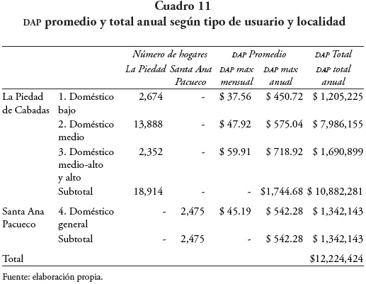 De esta forma, la DAP agregada de los hogares de ambas localidades asciende a 12 millones 224 mil 424 pesos por año. Obsérvese que la participación de La Piedad es mucho mayor con relación a la de Santa Ana Pacueco, ya que la primera aportaría 89% de la DAP total anual. A su vez, el estrato de hogares de más peso por el monto total de su DAP, es el doméstico medio que aporta más de 73% de la DAP de La Piedad de Cabadas, y más de 66% de la DAP total de ambas localidades; tal comportamiento se explica por el número de hogares pertenecientes a cada subgrupo de la población.
