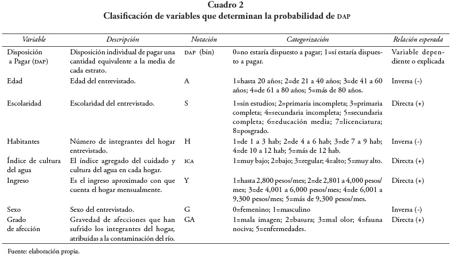 En el cuadro 2 se describe cada variable, su clasificación, simbología utilizada y el sentido de la relación esperada de cada variable explicativa con la variable dependiente. Por ejemplo, esperamos que la edad del entrevistado tenga una relación inversa con su DAP ya que, mientras mayor sea ésta, menor será la probabilidad de que acepte realizar el pago. Ejemplo contrario, el ingreso, variable que a medida que incrementa, se espera que mayor sea la probabilidad de aceptar el pago (Franzen y Vogl, 2013).