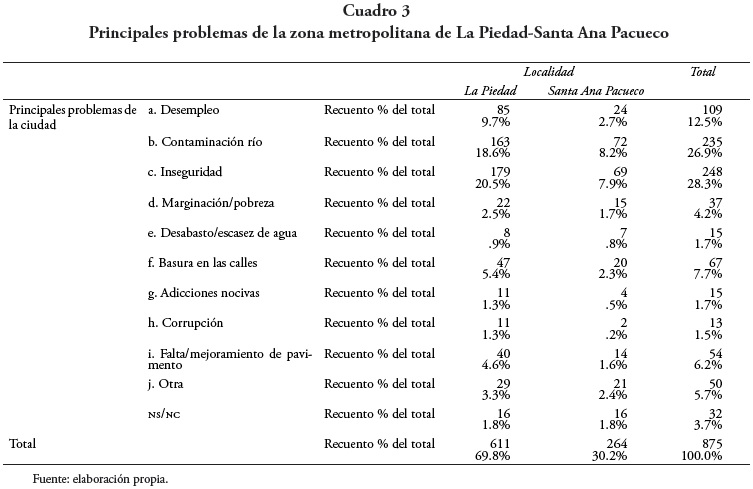 De acuerdo con los resultados obtenidos a partir del estudio a hogares, para los habitantes de esta ZM la contaminación del río es uno de los principales problemas que enfrentan, es superado solamente por la inseguridad, pero considerada más grave aún que el desempleo, la falta de limpieza en las calles, la falta de pavimentación e incluso que la marginación o la pobreza (cuadro 3). Obsérvese el comportamiento similar y proporcional en las respuestas de ambas localidades.