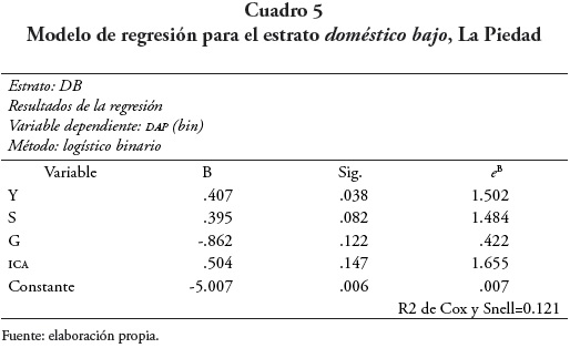 En total se entrevistaron 140 hogares pertenecientes al estrato doméstico bajo, equivalente a 22.91% de la submuestra de La Piedad. Los resultados del modelo de regresión logarítmica, calculado a partir de estos datos, se resumen en el cuadro 5.
