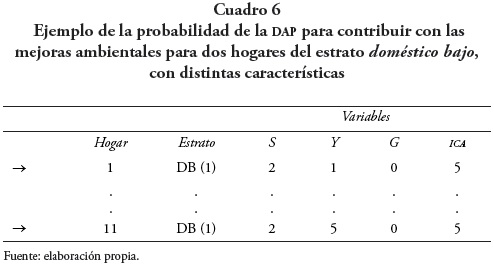 Supongamos entonces que, a partir de los datos contenidos en el cuadro 6, deseamos conocer la probabilidad de que el hogar 1 acepte dar el pago por mejoras ambientales. Al sustituir los datos reales de este hogar en el modelo estimado, observaremos que el logit obtenido en este caso es -1.2908, por lo que la probabilidad estimada de aceptar el pago es 0.2157. Esto es, un hogar con las mismas características de este primer caso muy seguramente rechazaría el pago propuesto.10 Por el contrario, un hogar como el 11 del cuadro 6, seguramente aceptaría el pago propuesto ya que su probabilidad de hacerlo es de 0.58 (casi 60%), lo que resulta tanto de un mayor nivel de ingreso (Y) como de una cultura del agua (ICA) más elevada respecto al primer caso analizado. El comportamiento positivo de esta última variable respecto a la DAP es consistente con lo reportado por Husted et al. (2013), quienes señalan que una actitud o cultura más pro-ambiental aumenta la DAP marginal; en nuestro caso, DAP máxima.