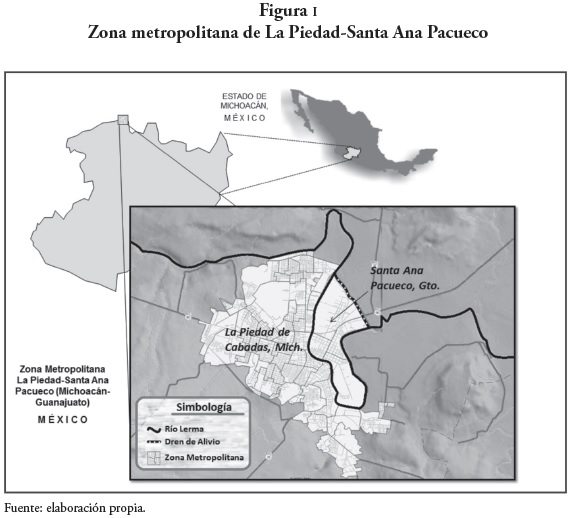 La Piedad de Cabadas, Michoacán, y Santa Ana Pacueco en Pénjamo, Guanajuato, son localidades colindantes separadas de manera natural por el lecho del río Lerma (figura I). Recientemente, estas dos localidades formaron la zona metropolitana La Piedad-Santa Ana Pacueco para promover un desarrollo conjunto y atender problemas comunes.