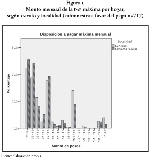 A la submuestra que se declaró a favor del pago (n=717) también se le preguntó acerca del monto que podría aportar de manera mensual sin afectar su situación económica. Los montos obtenidos van desde los cinco hasta los 150 pesos mensuales por hogar. Las cantidades que se mencionaron con mayor frecuencia estuvieron ubicadas, en primer lugar, por debajo de los 10 pesos mensuales (25% de los casos), en segundo lugar, entre los 11 y 20 pesos mensuales (18% de los casos en La Piedad y 22% en Santa Ana), y en tercer lugar se ubican montos mayores que van de los 40 a los 50 pesos con 17% de los casos en La Piedad y 19% en Santa Ana (figura II).