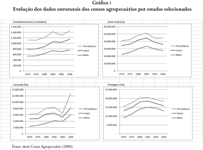 De acordo com as informações divulgadas pelo IBGE-Censo Agropecuário (2006), o número de estabelecimentos rurais aumentou em todas as regiões do Brasil, relativamente ao censo anterior. A região nordeste respondeu por 47.4% dos estabelecimentos em 2006 e apresentou um crescimento de 6.13% entre 1996 e 2006, enquanto o Brasil como um todo teve um crescimento de 7.08%.