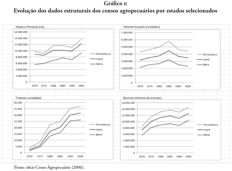 Os Estados da Bahia, Ceará e Pernambuco apresentam um quadro semelhante à trajetória do nordeste como um todo. Na Gráfico I, pode-se observar que o Estado de Pernambuco sobressai-se aos outros estados considerados quanto aos números de estabelecimentos rurais, áreas desses estabelecimentos, terras utilizadas (lavouras, pastagens e matas/florestas), pessoal ocupado, tratores e efetivo de bovinos. A exemplo de outras regiões do país, todos os estados selecionados apresentaram uma trajetória decrescente desses indicadores a partir de 1985. Houve recuperação quanto ao número de estabelecimentos e lavouras, já as pastagens continuaram declinando ao longo do tempo.