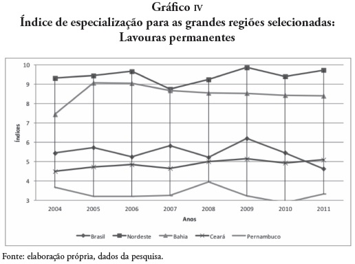 Pela observação do gráfico III, relativo à lavoura temporária, vê-se que o Estado de Pernambuco apresenta um índice de especialização inferior aos índices da Bahia e Ceará. Isso significa que, no período analisado, o Estado do Ceará apresentou maior diversificação das culturas temporárias, relativamente às outras regiões consideradas, com um padrão muito semelhante ao da região nordeste como um todo. Contudo, deve-se ressaltar que o Estado do Ceará apresentou mudanças na trajetória produtiva ao longo do período analisado, isso pode significar que houve maiores instabilidades na região, quer sejam por fatores climáticos, econômicos ou políticos.