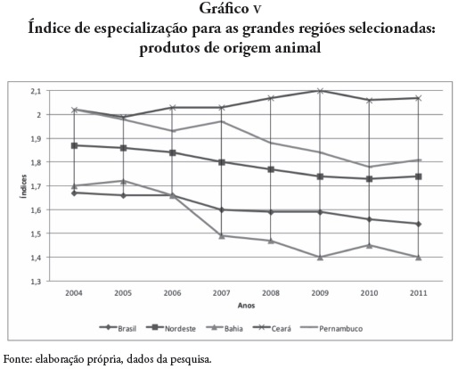 No gráfico 3, relativo à produção de origem animal, percebe-se que, de uma maneira geral, a produção é muito concentrada. Ou seja, as regiões especializam-se em poucos produtos. Contudo, observa-se um padrão de crescimento da diversificação no Ceará, enquanto a Bahia vai se tornando mais especializada em poucos produtos.
