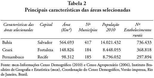 Em Pernambuco, existem 1.746.164 habitantes rurais. A extensão territorial é de 98.312 Km2, com 4.974.587 hectares de terras agricultáveis e 297.894 estabelecimentos rurais. Foram escolhidas também três cidades, Caruaru possui 36.853 habitantes rurais com 4.145 propriedades rurais, Garanhuns 14.048 moradores rurais e 3.088 estabelecimentos, finalmente Petrolina com uma população rural de 74.772 e 5.213 unidades de propriedades rural (IBGE-Censo Agropecuário, 2006).