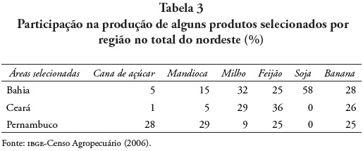 Na tabela 3, percebe-se que a Bahia apresenta-se com importante participação na produção nordestina de soja, milho, banana e feijão. Já o Ceará destaca-se na produção de milho, feijão e banana; enquanto Pernambuco tem maior representatividade na produção de mandioca (macaxeira) e cana de açúcar.