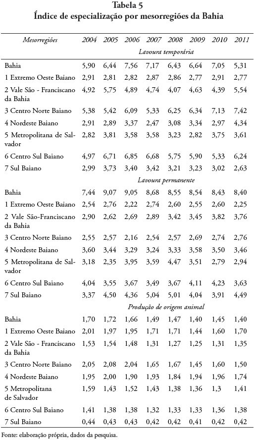 Observando-se os dados da tabela 5, percebe-se que os resultados por mesorregião corroboram com os resultados anteriores. O Estado da Bahia apresenta menor diversificação da estrutura produtiva no que se refere à produção de origem animal. Na análise mais detalhada, por municípios mesorregiões, o Centro Oeste Baiano apresenta-se com padrão menos diversificado quantos às lavouras. Quanto à produção pecuária e produtos derivados, o Sul da Bahia mostra-se com uma tendência clara de especialização ano após ano.