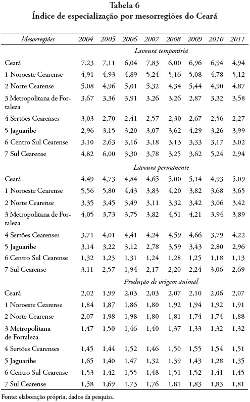 Na análise do Ceará (tabela 6), observa-se que a mesorregião dos Sertões Cearenses apresenta um padrão de menor diversificação quanto à produção de lavouras temporárias. Relativamente às lavouras permanentes, o destaque dá-se para a mesorregião do Centro Sul Cearense. Com relação aos produtos de origem animal, deve-se observar que não há distinção entre as mesorregiões, todas apresentando baixo nível de especialização, a exemplo do Estado.