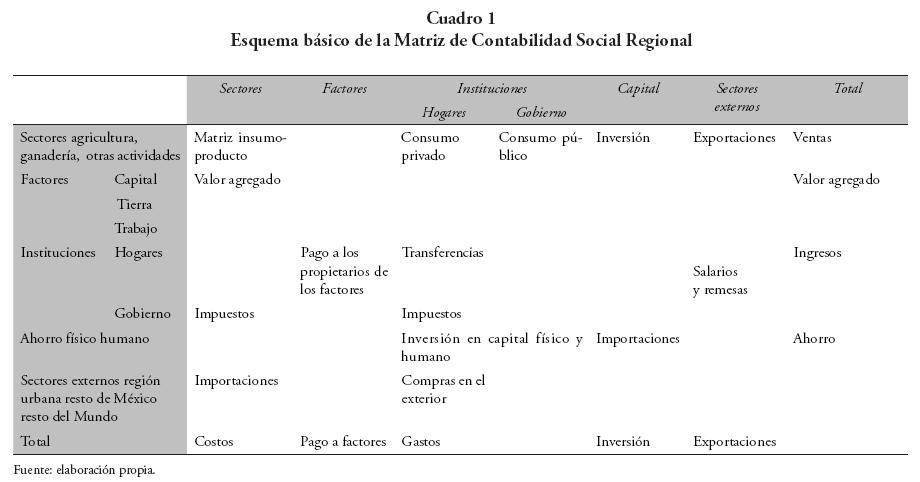 El esquema básico de una MCS desagregada a nivel regional se muestra en el cuadro 1; las cuentas se clasifican por lo general en cinco grandes grupos: actividades, factores, instituciones (familias y gobierno), capital y sector externo. En la MCS cada sector/agente está representado por una fila y una columna. Por convención, las columnas recogen los gastos y las filas los ingresos. En notación matricial, si la MCS es la matriz X, cada elemento xij es el ingreso del sector/agente i que proviene del sector/agente j.