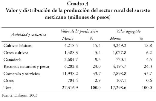 El cuadro 3 muestra el valor de la producción regional así como el valor agregado que se genera por las actividades productivas definidas en la MCS para el sector rural del sureste mexicano. Del valor total de la producción, 30.3% proviene del sector agropecuario (agricultura y ganadería). El componente de este sector que más contribuye a la generación de valor agregado es el de cultivos básicos (18.8%), seguido de otros cultivos (6.2%). La actividad de recursos naturales y pesca contribuye con 23.0% del valor de la producción y 24.3% del valor agregado. El sector comercio y servicios representa 43.7% del valor de la producción y 45.7% del valor agregado total, principalmente por la elevada retribución al trabajo familiar en esta actividad.