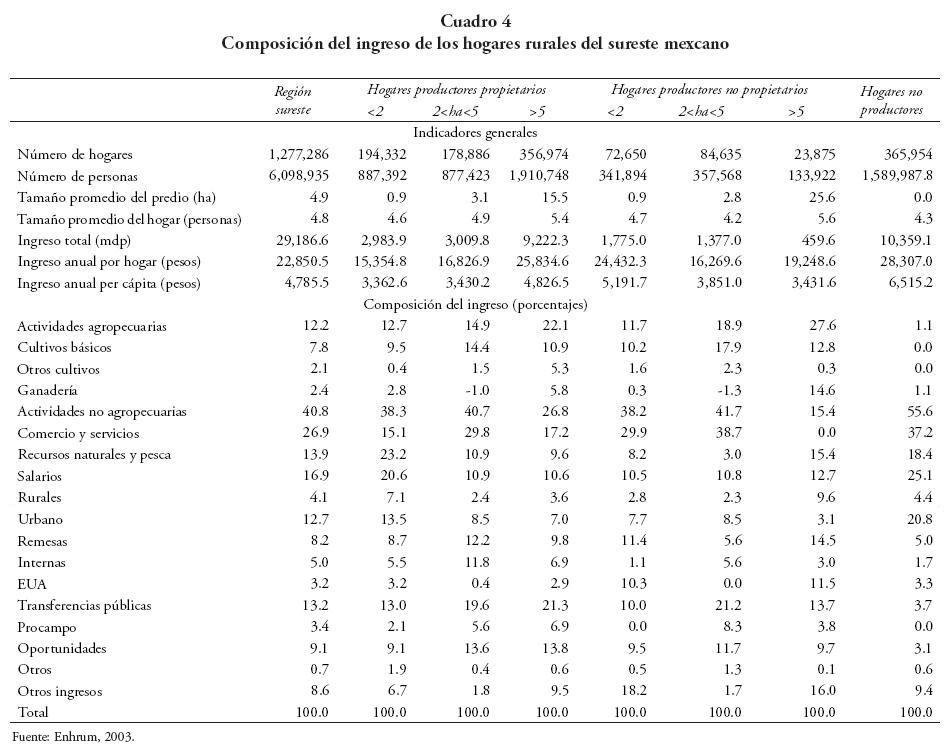 En promedio, en el 2002, un hogar rural del sureste mexicano obtuvo un ingreso anual de 22,851 pesos o el equivalente a 1,900 pesos mensuales. En términos per cápita, cada miembro del hogar obtuvo un ingreso promedio de 4,786 pesos anuales o el equivalente a 400 pesos mensuales. Los hogares no productores ostentan los mayores niveles de ingreso por hogar y por persona de todo el sector rural del sureste mexicano. Su nivel de ingreso per cápita es 90% mayor que el de los hogares productores propietarios de menos de dos hectáreas. Este grupo de hogares presenta los niveles más bajos de ingreso por hogar y por persona (cuadro 4).