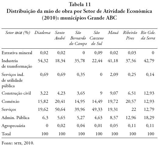 A tabela 11 chama a atenção para as cidades de Mauá e Rio Grande da Serra com mais de 40% dos seus trabalhadores formais ocupados na indústria e principalmente Diadema, que ainda em 2010 tinha mais de 50% de seus empregos formais no setor da indústria de transformação. Ou seja, mesmo cidades que perdem participação relativa no que tange ao valor adicionado industrial, continuam tendo suas economias fortemente baseadas na indústria. Na outra ponta estão São Caetano do Sul e Santo André, cidades em que a indústria de transformação representa apenas cerca de 20% do mercado de trabalho formal, e cujo setor de serviços é responsável por aproximadamente 50% do estoque de vagas.