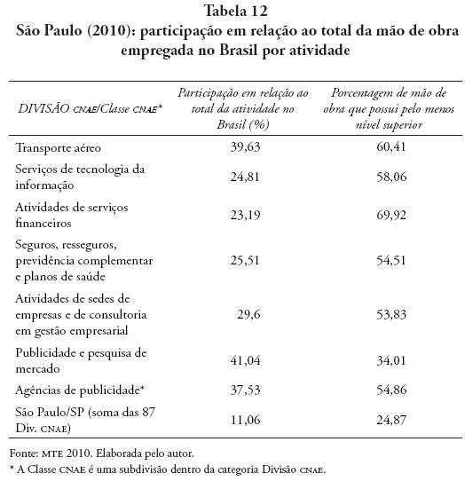 Já a cidade de São Paulo, com base mais uma vez nos dados da RAIS, mostra concentrar serviços mais modernos e especializados, típicos de cidades que estão no topo da hierarquia urbana. A tabela 12 mostra que a cidade concentra grande parcela de profissionais atuando no Brasil em algumas atividades, como: publicidade e pesquisa de mercado (41%); transporte aéreo (40%); atividades de sedes de empresas e de consultoria em gestão empresarial (30%); seguros, resseguros, previdência complementar e planos de saúde (26%); atividades dos serviços de tecnologia da informação (25%); atividades de serviços financeiros (23%). Fica evidente também a alta participação de trabalhadores com nível superior nessas atividades na comparação com o total das divisões da Classificação Nacional de Atividades Econômicas.