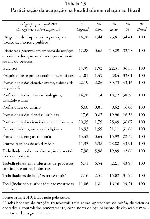 A tabela 13 traz uma comparação entre São Paulo/SP e o ABC a partir da proporção (em relação total nacional) de cargos ocupados por trabalhadores com nível superior e cargos de dirigentes. Na última linha da tabela está a proporção do total do emprego formal nestas localidades, em relação ao Brasil. Assim, por exemplo, a tabela mostra que estão em São Paulo/SP cerca de 19% dos dirigentes de organizações e empresas (excetuando-se as de interesse público) no país, além de 24% dos "pesquisadores e profissionais policientíficos", enquanto a participação da cidade no mercado de trabalho brasileiro corresponde a 11% dos postos de trabalhos totais.
