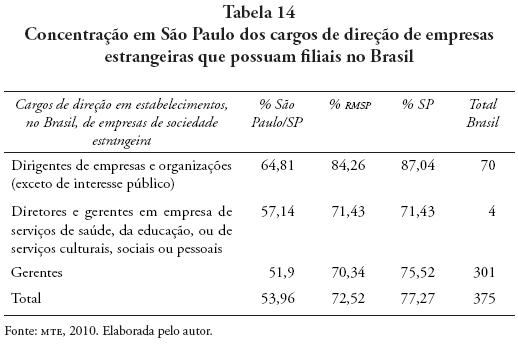 O caso da capital paulista é bastante diferente. Se restringirmos a análise do emprego para um enfoque sobre os cargos de direção filiais de empresas estrangeiras instaladas no Brasil, São Paulo aparece nitidamente como cidade preferida no Brasil. Certamente os números absolutos destes cargos são muito pequenos, conforme tabela 14 (coluna Total Brasil), mas é sintomática a alta concentração, principalmente do cargo mais alto na hierarquia.