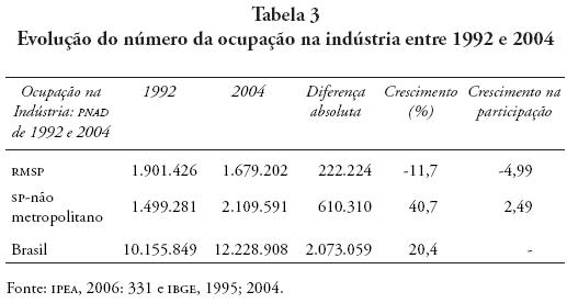 Os dados da tabela 3 extraídos de estudo do Instituto de Pesquisa Econômica Aplicada (IPEA) com base em dados da Pesquisa Nacional por Amostra de Domicílios (PNAD) ilustram o fenômeno da "desconcentração" do ponto de vista do mercado de trabalho paulista em período recente: enquanto a RMSP fechou 11,7% de seus postos de trabalho na indústria entre 1992 e 2004, neste mesmo período os postos da indústria no "São Paulo não metropolitano" tiveram um incremento de 40,7%. Ou seja, o estado de São Paulo-não metropolitano aumentou sua participação relativa no total de mão de obra ocupada na indústria de 14,76 para 17,25% no período.
