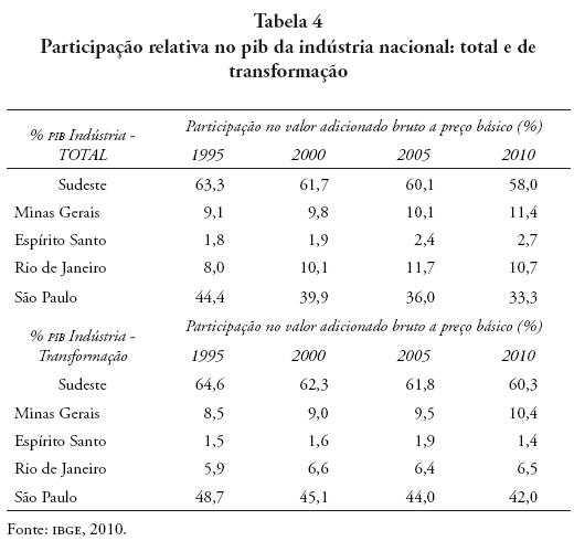 A tabela 4 mostra a evolução da participação da região sudeste e do estado de São Paulo no PIB industrial brasileiro a partir de 1995, sob o olhar da indústria como um todo, e da indústria de transformação. O Grande Setor Indústria do IBGE, compreende além da indústria de transformação, a construção civil, a indústria extrativa mineral e os serviços industriais de utilidade pública (produção e distribuição de energia elétrica, gás encanado, etc.). Um primeiro ponto a se destacar na tabela 4 é que sob qualquer dos dois aspectos, o sudeste perdeu pouquíssima participação no período 1995-2010. Se excluíssemos São Paulo, o restante do sudeste teria ganho participação no VAB da indústria nesse período. Ou seja, a questão da desconcentração versus reconcentração é bastante complexa.